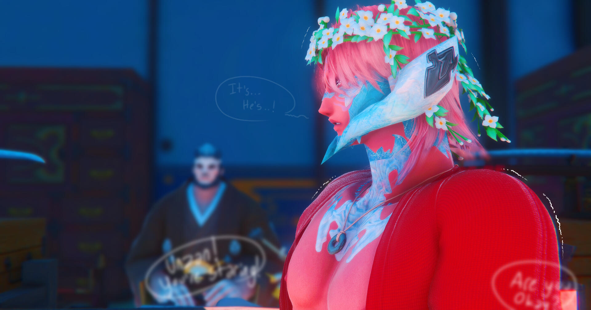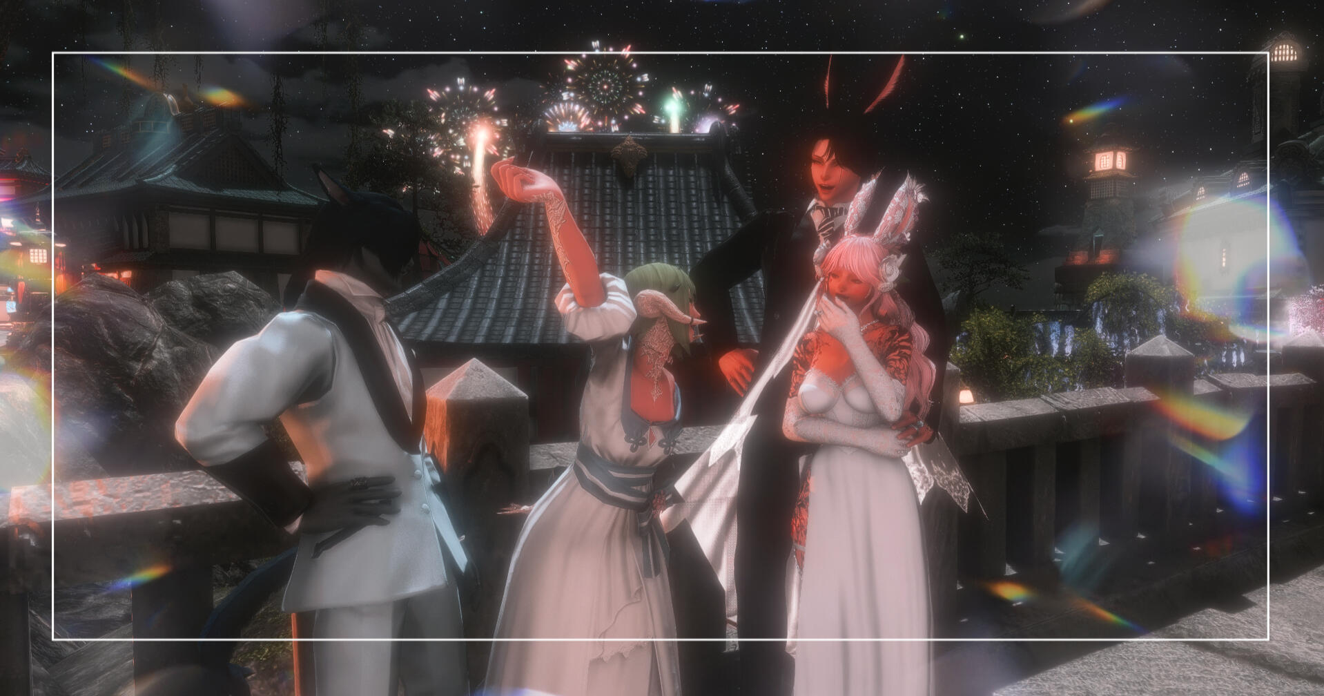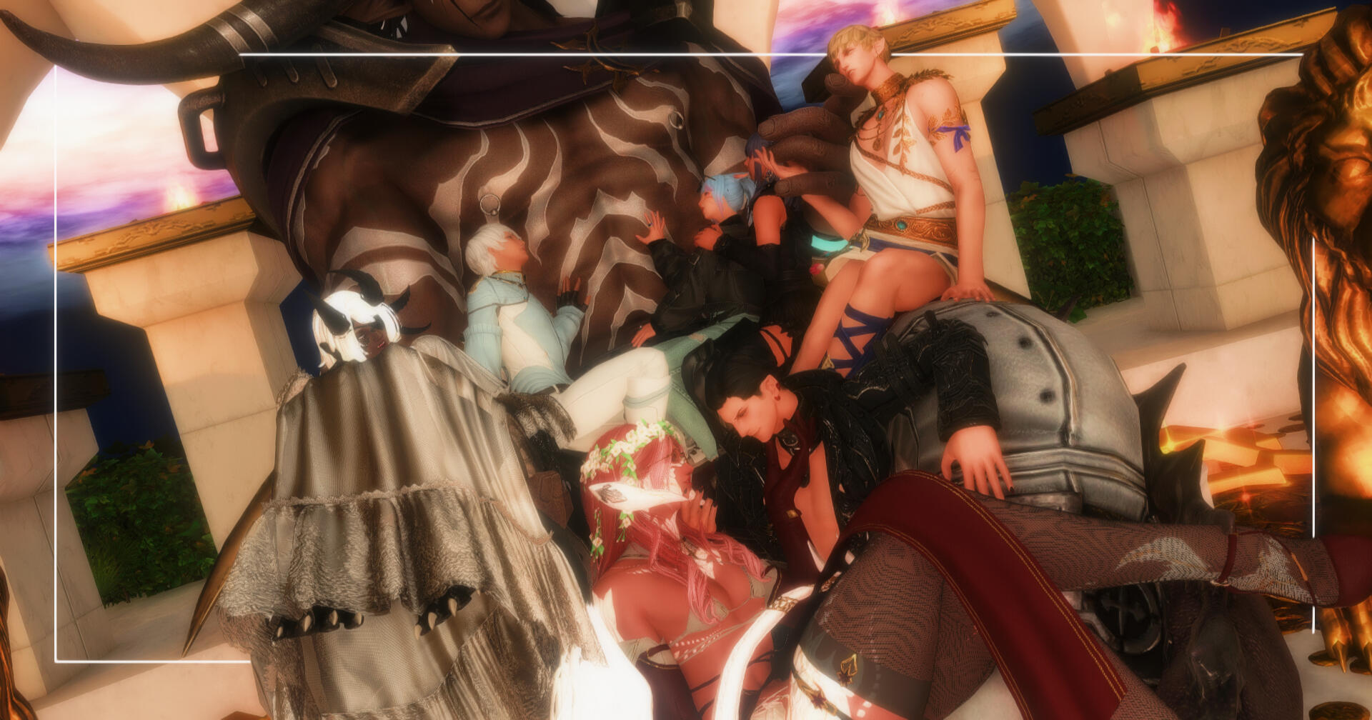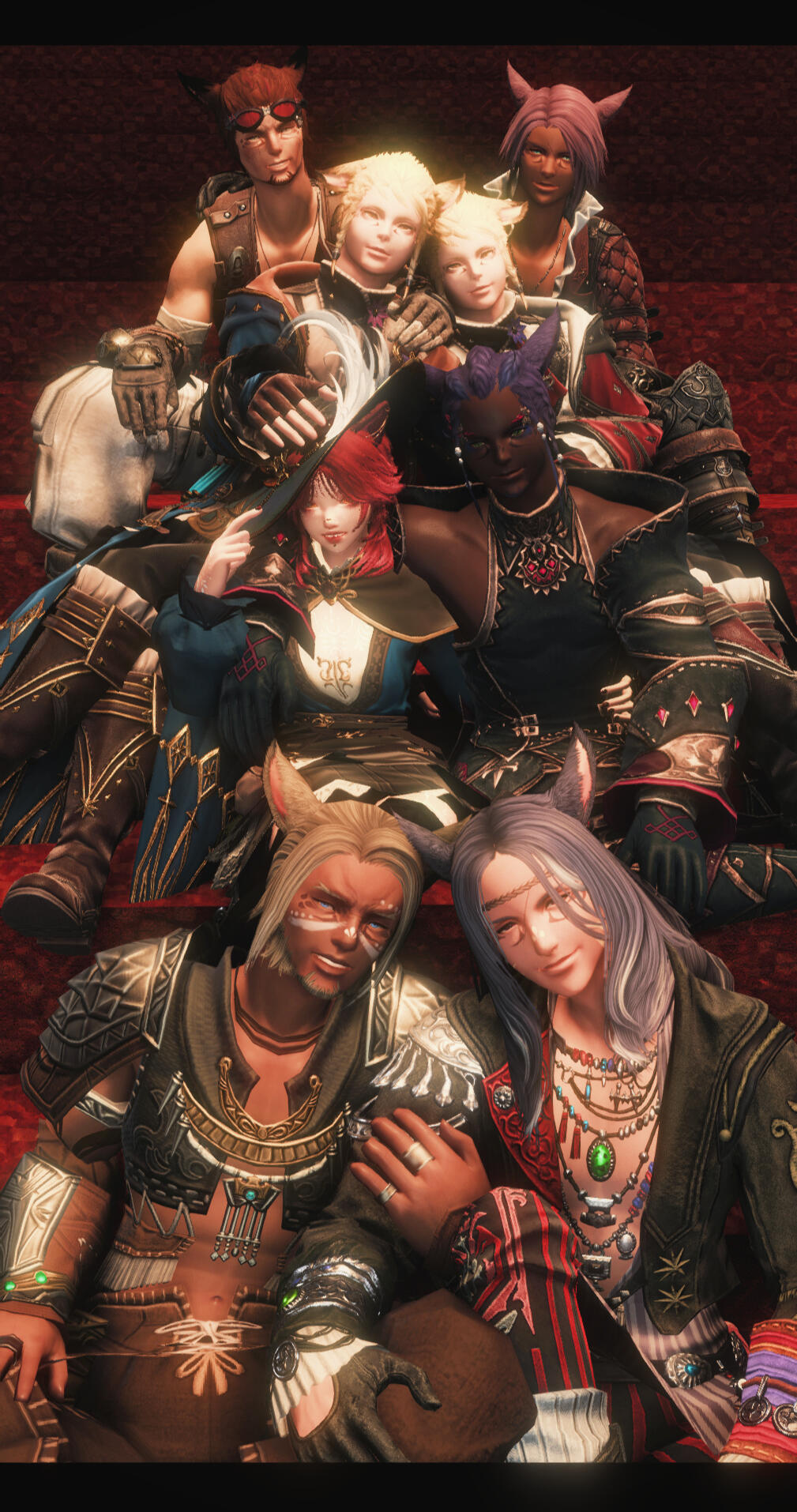 Due to the nature of large group shots, these will take longer and cost more. Do keep in mind that you'll need a lengthier time slot and that these can get quite pricey. This tier can also include NPCs and OCs. The NPCs can be customized to your preference, and anamnesis/glamourer/mare files need to be provided in advance for OCs or other player subjects who were otherwise unable to be present for the shooting. This tier may even be used for a self-indulgent shot of 3 or more NPCs or OCs alone, so long as the circumstance is discussed in advance.